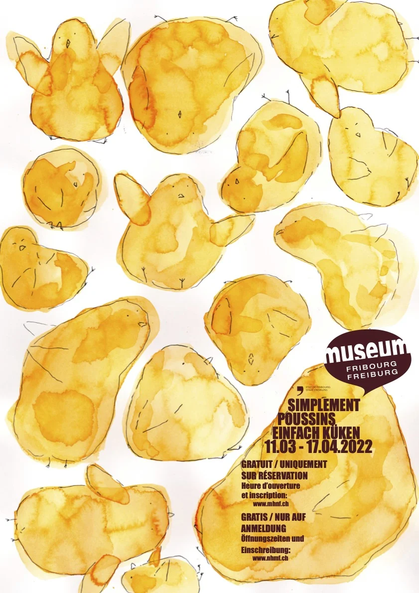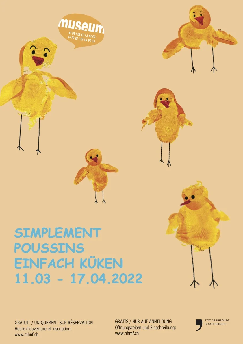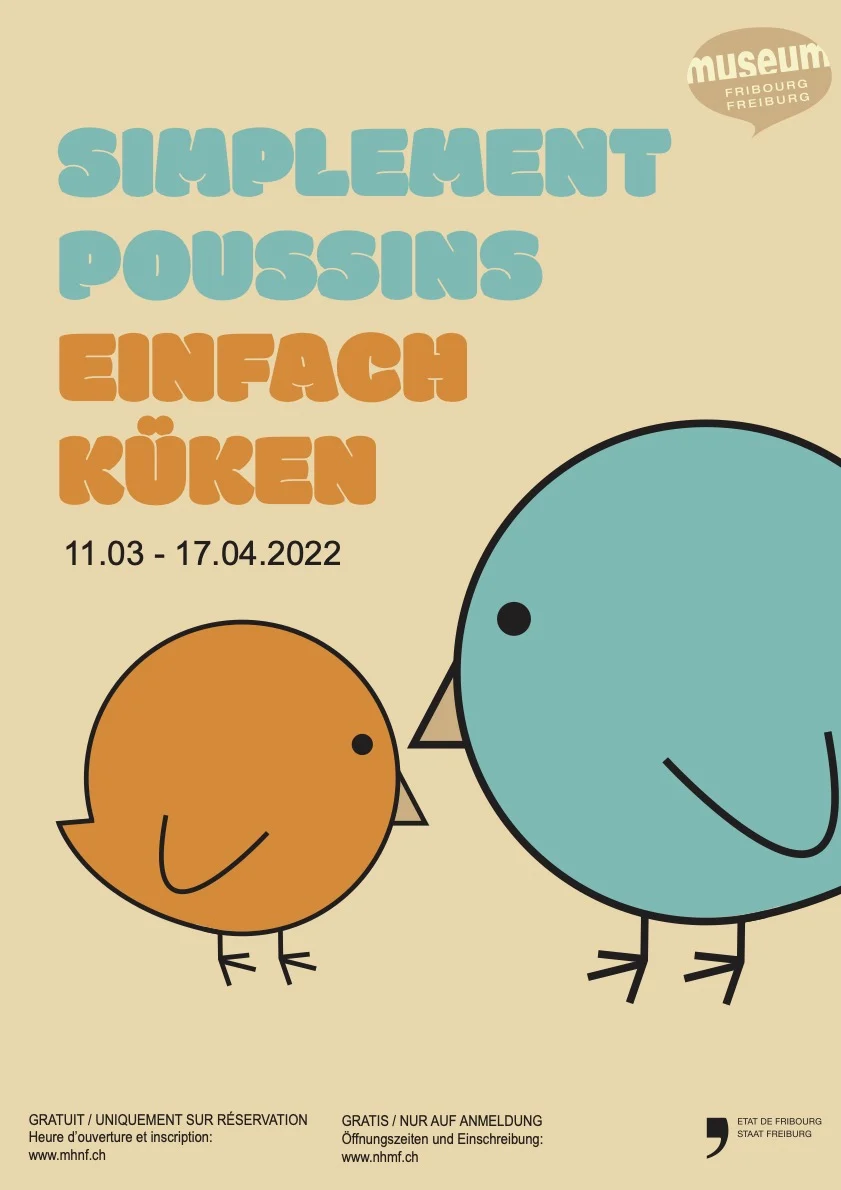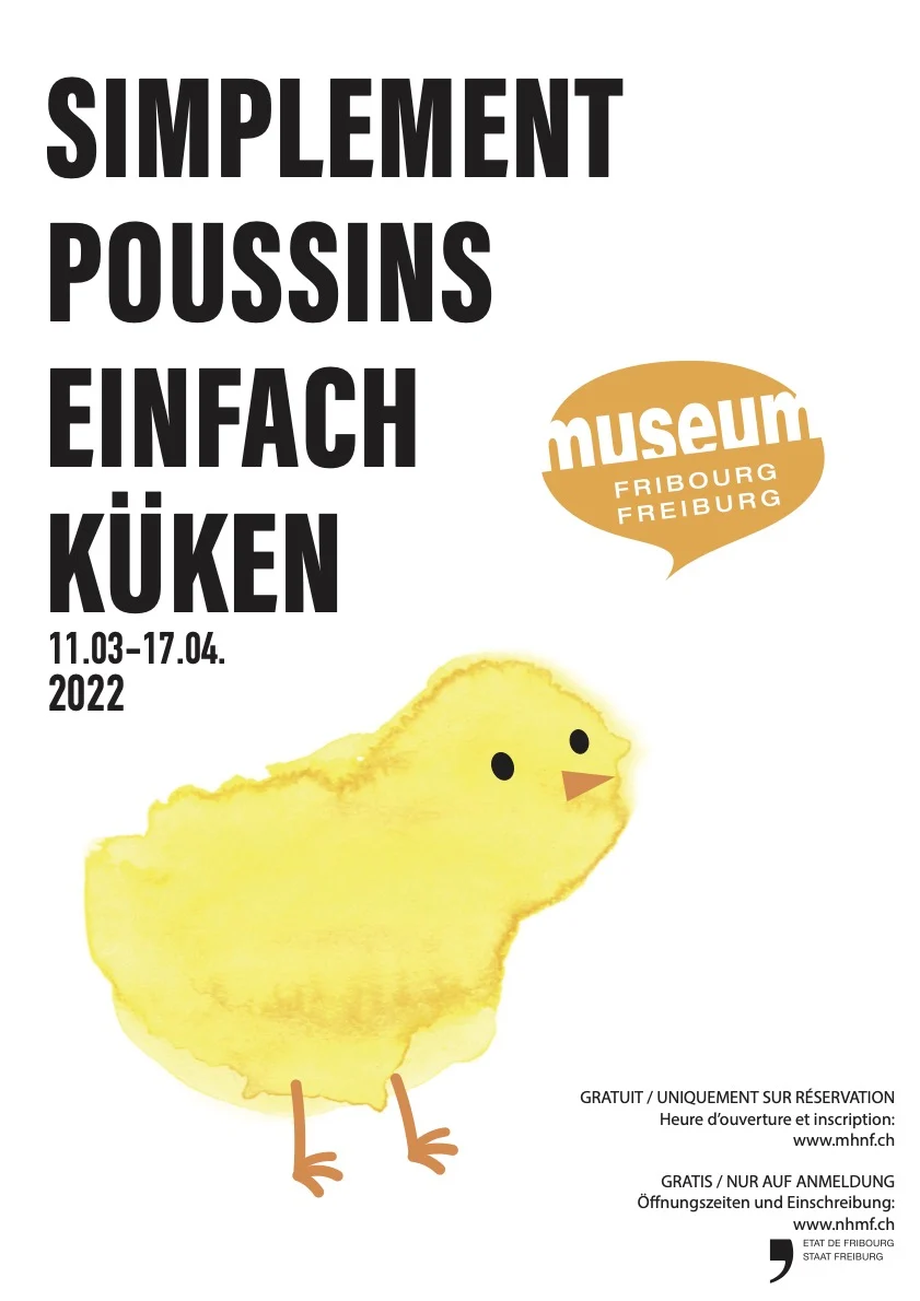 Création et réalisation de l’affiche pour l’exposition Poussins du Musée d’Histoire Naturelle de Fribourg. Recherches ciblées pour une communication avec un public cible spécifique, composition, mise en page, gestion de la typographie.