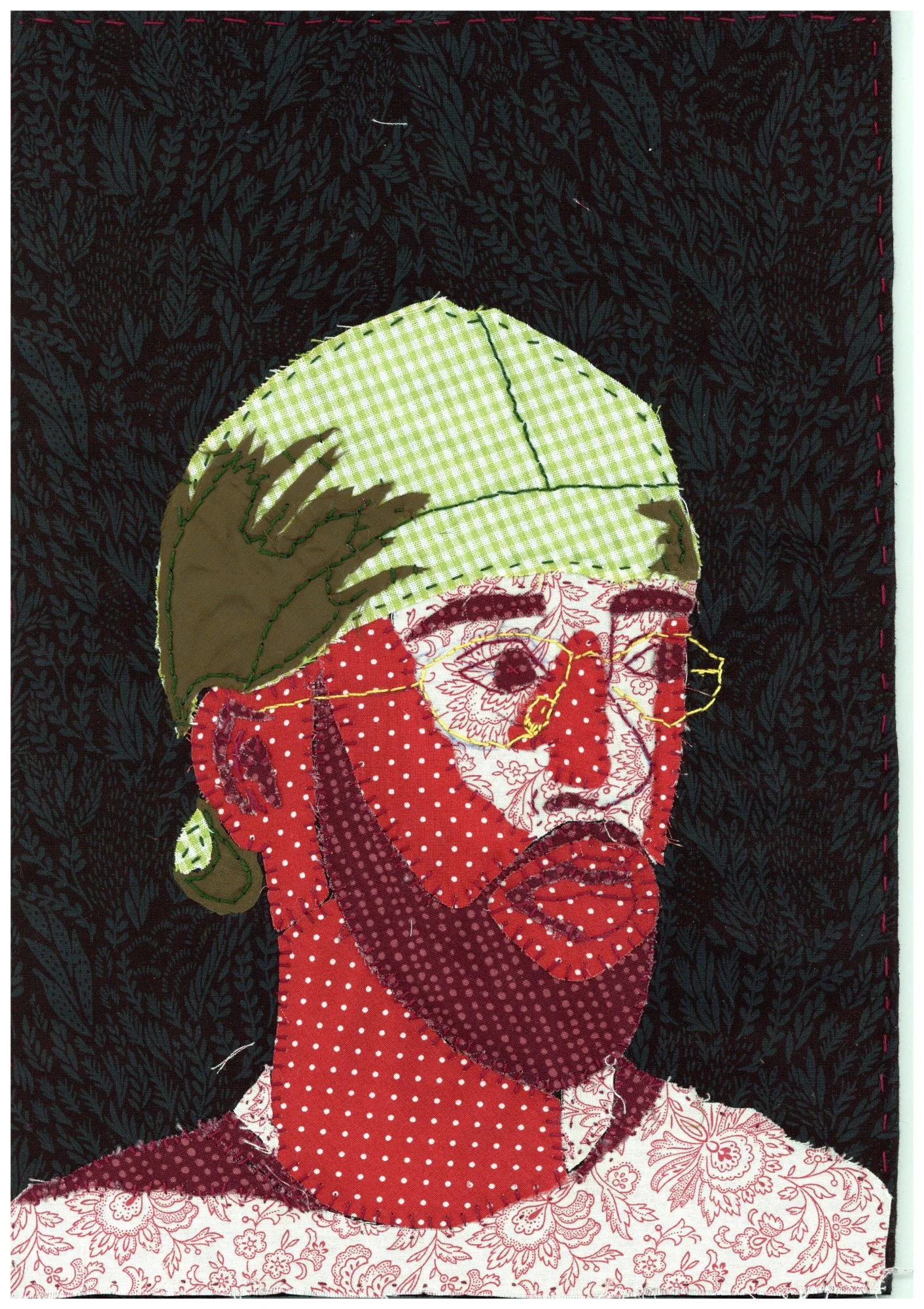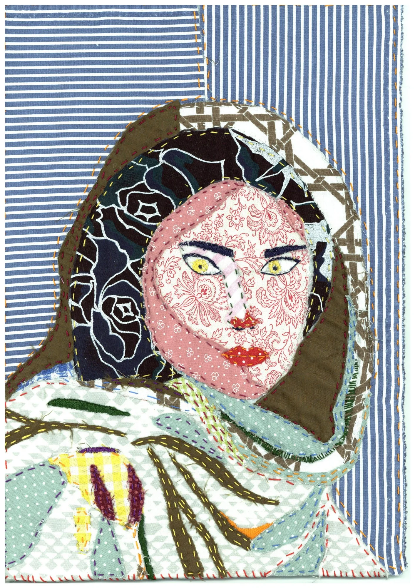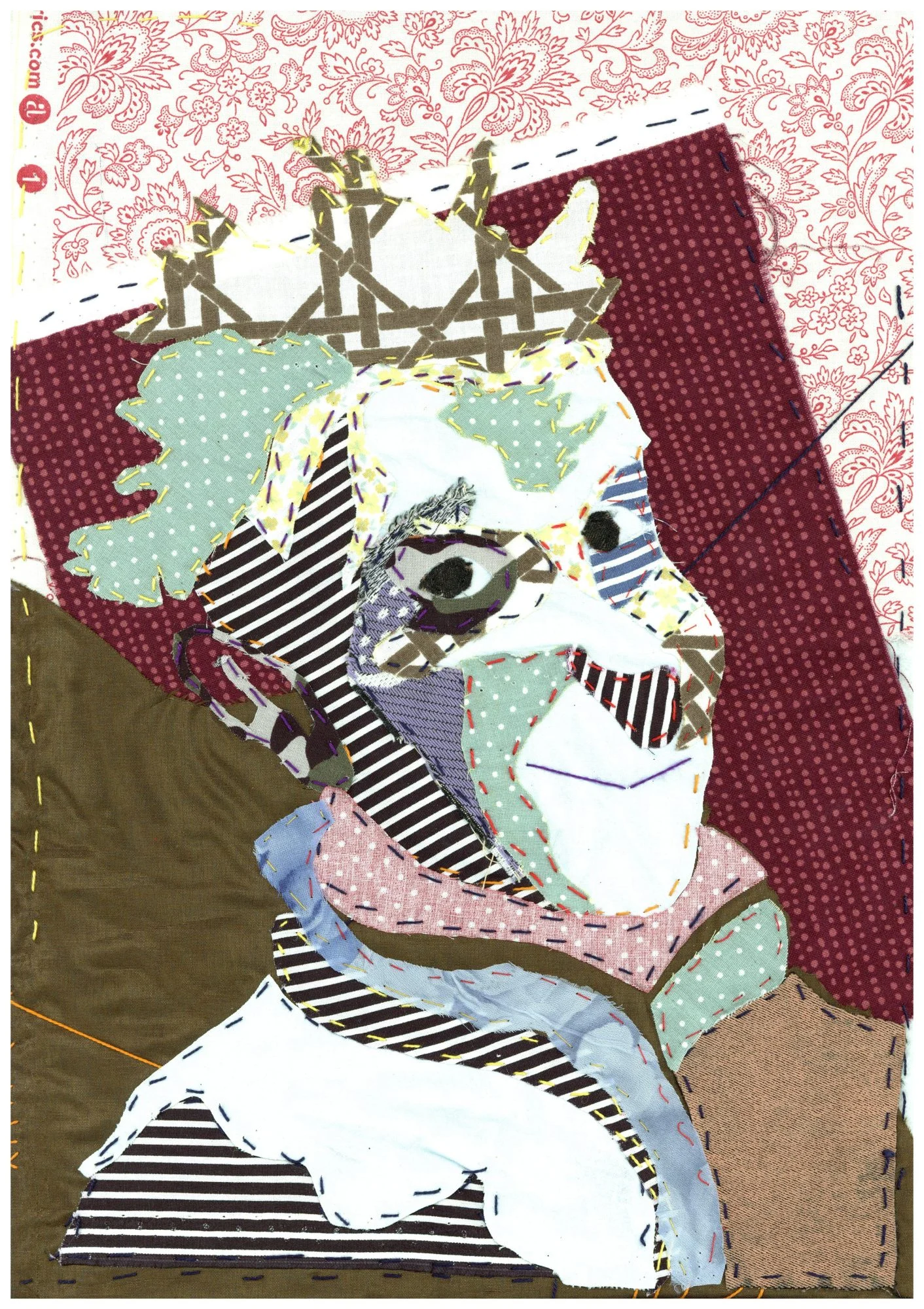 Réaliser un portrait en tissu (couture) en explorant la composition, les contrastes de couleur et la diversité des motifs. Inspiration : Pop Art.