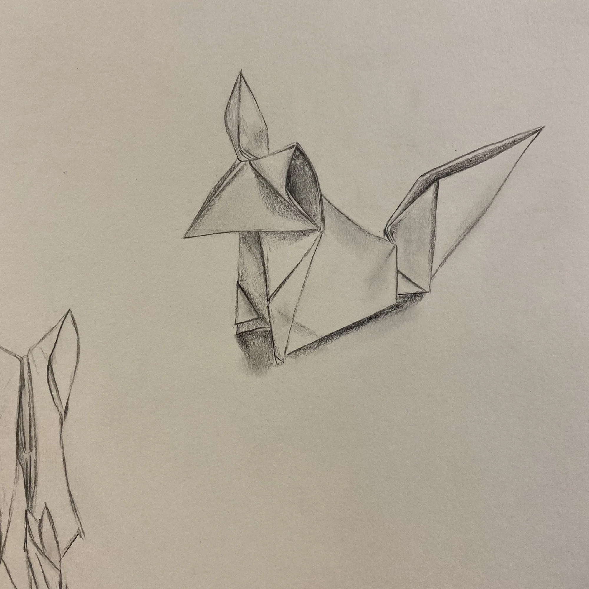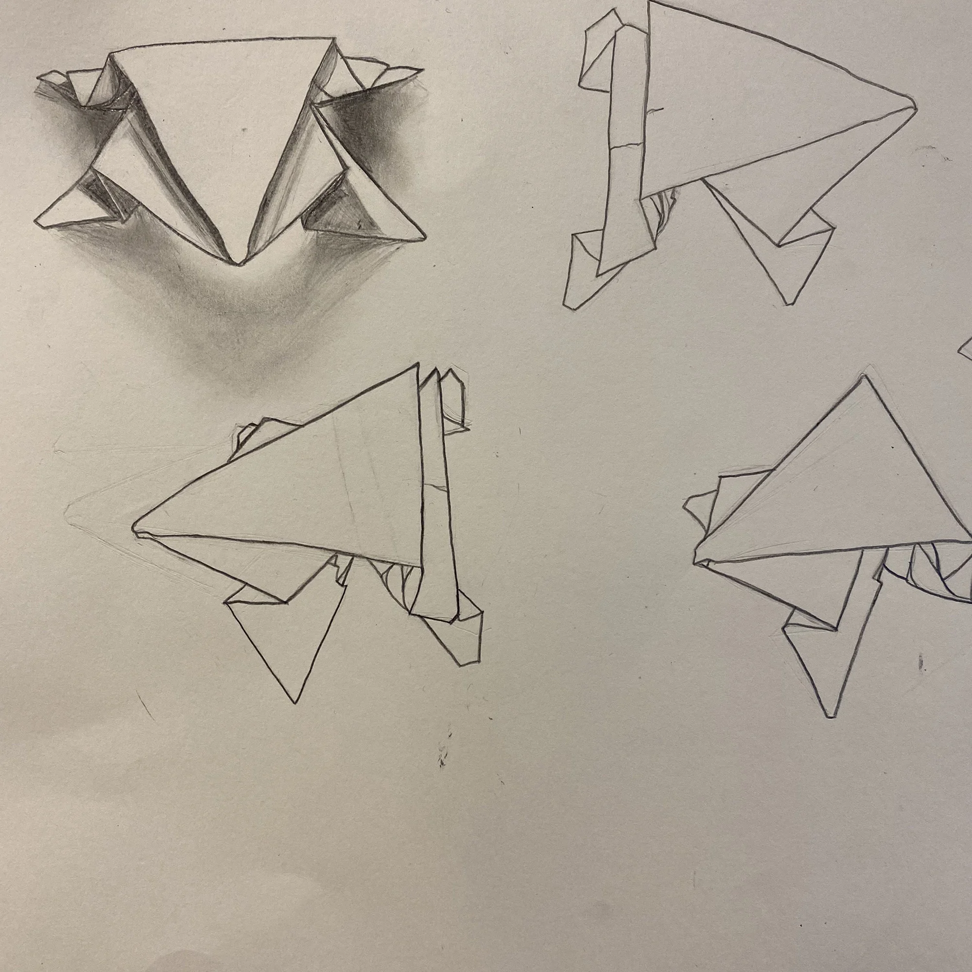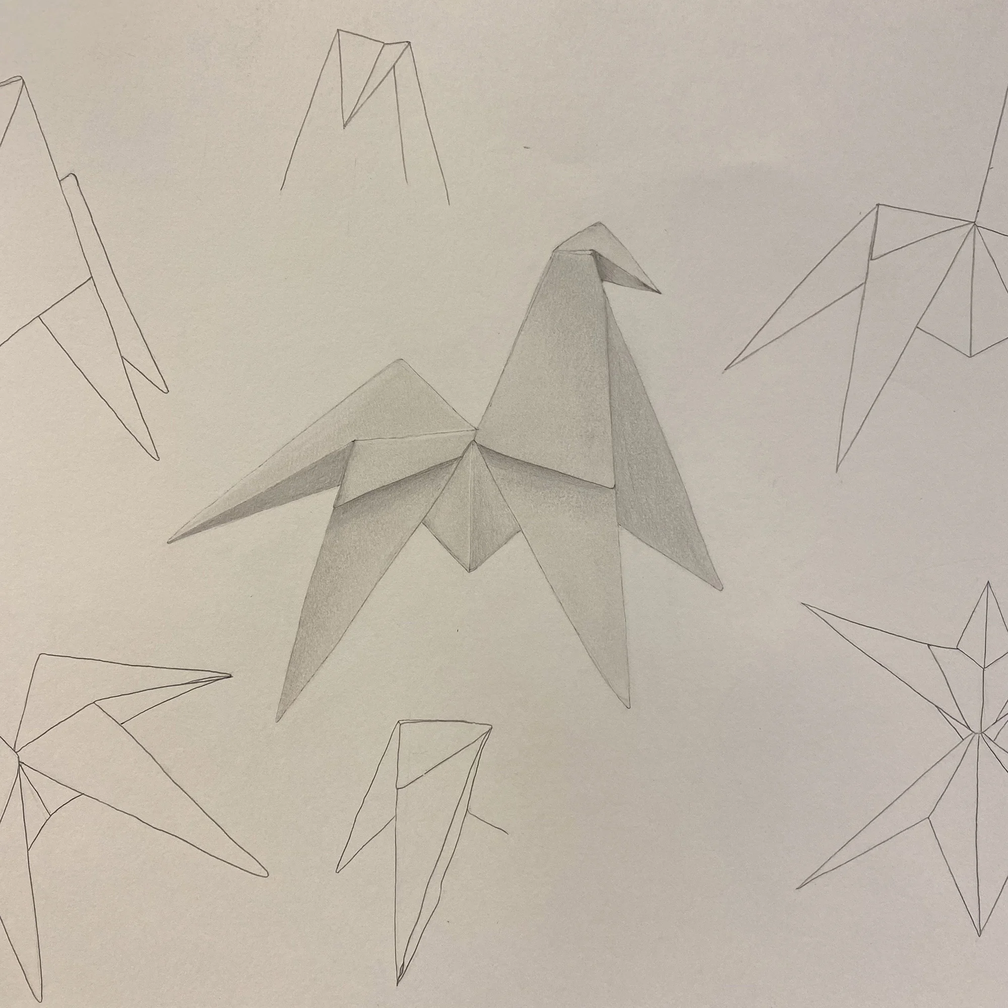 Dessin d’observation pur. Individuellement, les élèves choisissent un origami et le construisent. Ils étudient ensuite sa forme – dessin au trait uniquement – sous différents angles. Sur la fin, ils choisissent une des études et réalisent les ombrages et les niveaux de gris. Travail au crayon à papier – A3.